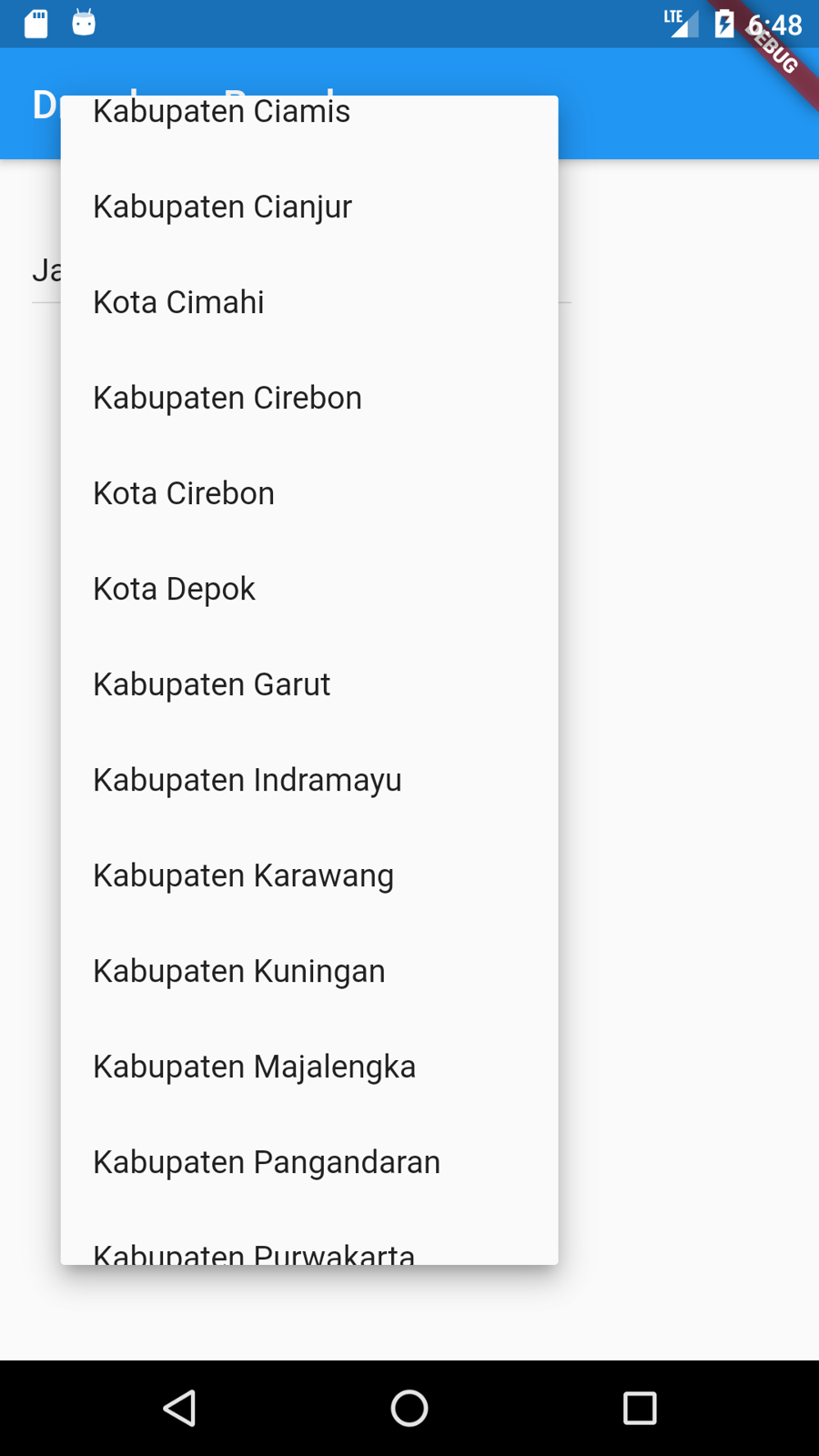 Hallo sobat flutter kembali lagi di posting saya , pada postingan kali ini saya akan membahas tentang Dropdown Menu Button apasih Dropdown Menu Button itu, Dropdown Menu Button adalah sebuah menu yang menampilkan sebuah daftar data yang fungsinya untuk memilih suatu nilai data itu sendiri untuk di inputkan kedalam suatu data global, tapi pada postingan kali ini kita akan melanjutkan materi yang kemarin menggukan rest api sebagai datanya dan kita akan buat bercabang atau saling berhubungan contohnya ketika kita memilih suatu tujuan lokasi pada saat pembelian kita akan di tampilkan sebuah dropdown dengan sebuah list array provinsi dan setelah selesai memilih array provinsi maka akan muncul otomatis list arrray kota sesuai dengan provinsi yang kita pilih okeh langsung saja kita mulai: